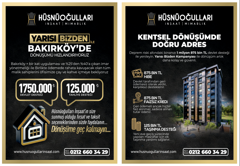 Hüsnüoğulları İnşaat & Kentsel Dönüşüm Ofisi olarak vizyonumuz, tüm projelerimizde konut kalitesi ve çevresel hassasiyetleri göz önüne alarak çağımızın evrensel koşullarına uyumlu bir şekilde ileriye doğru yol alırken, toplumların refahına katkıda bulunan özel sektör kuruluşlarının önde gelenleri arasında yer almaktır.